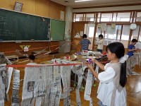 2年生の図画工作の授業の様子です。「つないでつるして」を学習しました。新聞紙を切り、どんどんとつないでいきます。つなげた新聞紙を教室内に吊るします。瞬く間に、教室が芸術空間となりました。驚くような劇...