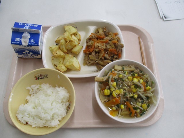 今日(10月1日)のj給食メニューは、「こしひかり」「牛乳」「ごま焼肉」「ローストポテト」「どさんこ汁」です。