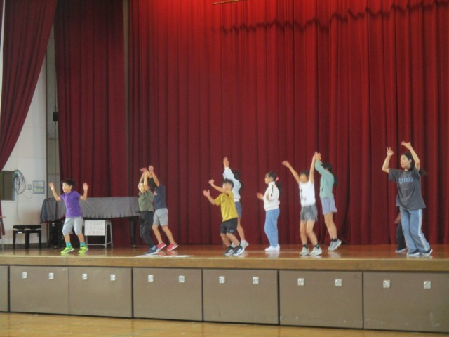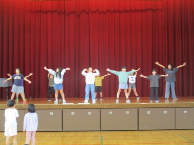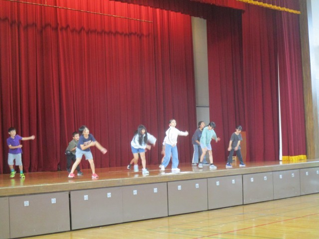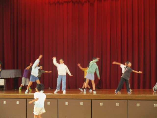 体育館へ行ってみると、子どもたちがトントンソーランの練習中です。地区の敬老会に出演する子どもたちが、踊りの振り付けや立ち位置の確認、練習をしていました。ドッジボールや鬼ごっこなどをして遊んでいる子どもたちも、音楽に合わせて手や足の動きをそろえる子もおり、石打小の子どもたちに踊りが身についている(音楽が流れれば自然に踊り出す)姿が確認できた場面でした。