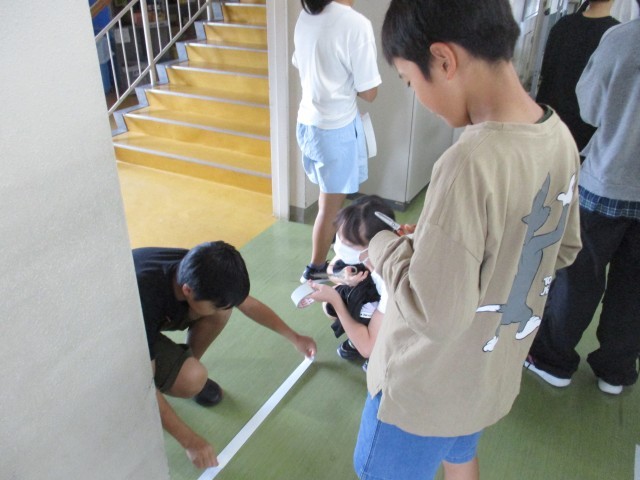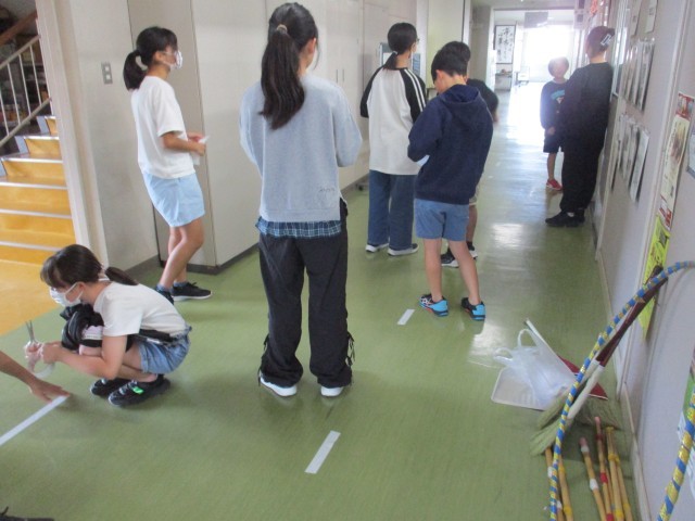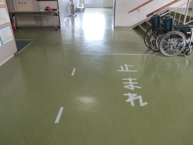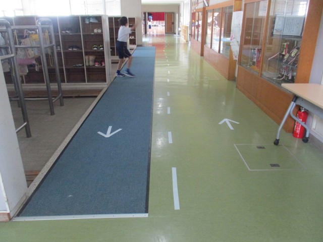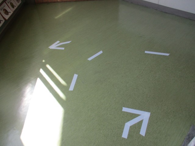 一方、校舎内に目を向けると、廊下の床面に見慣れない表示が・・・?