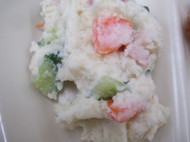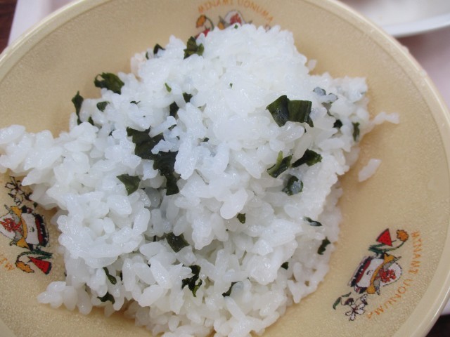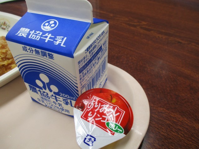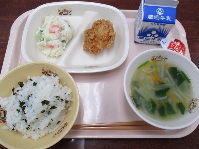 今日の給食は、3年生のリクエスト給食です。メニューは、「コシヒカリ」「鶏の唐揚げ」「ポテトサラダ」「コーンスープ」「りんごゼリー」「牛乳」です。
