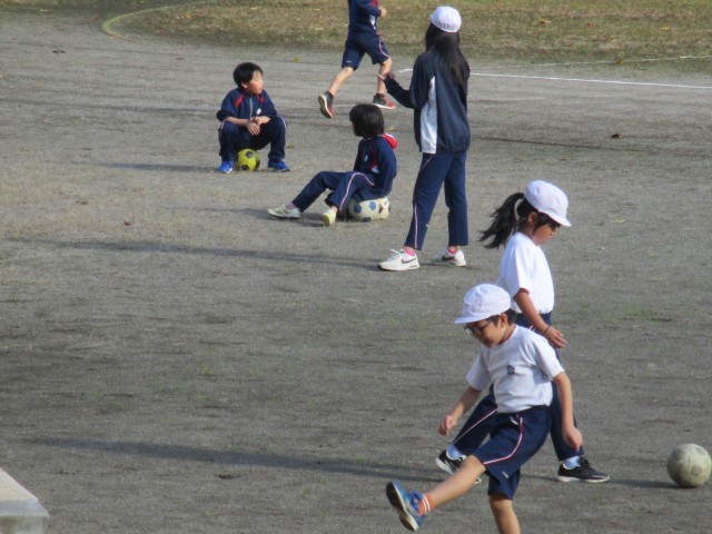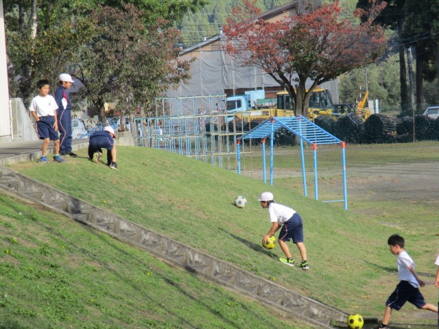 3年生の子どもたちは、体育の学習でサッカーに取り組んでいます。授業の開始時刻前には、多くの子どもたちがグラウンドに集まり、思い思いにドリブルやトラップ、シュート練習に取り組んでいます。