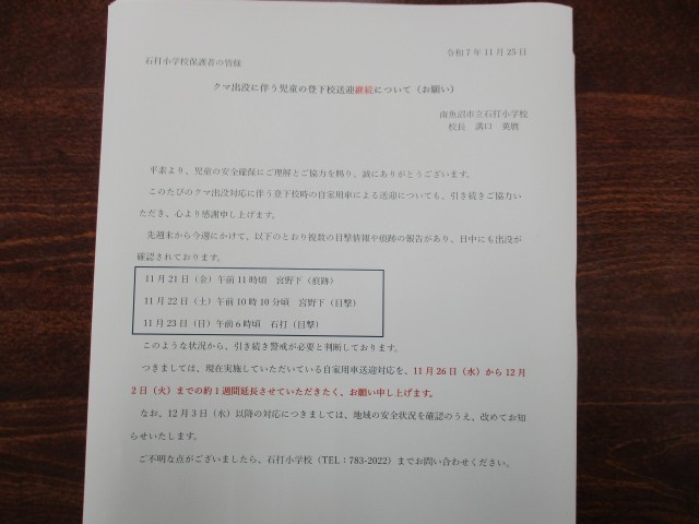 このたびのクマ出没対応に伴う登下校時の自家用車による送迎についても、引き続きご協力いただき、心より感謝申し上げます。
