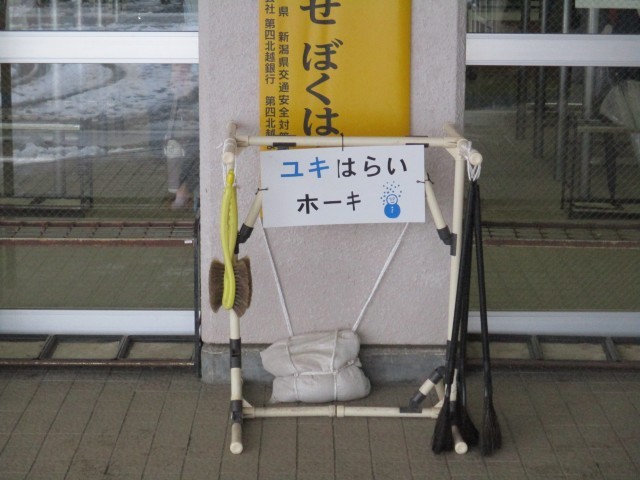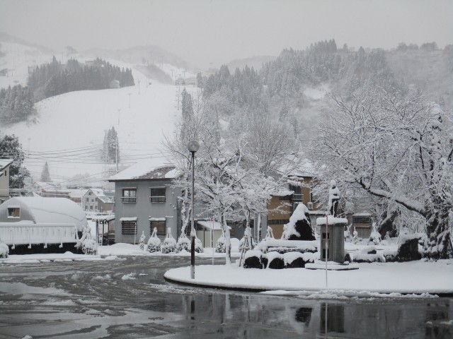 児童玄関前では、傘やランドセル、帽子にうっすらと積もった雪を払い、校内へと入っていきます。また、児童玄関前から見える石打丸山スキー場をじっと眺め、来るべきスキーシーズンへと思いを馳せているようです。
