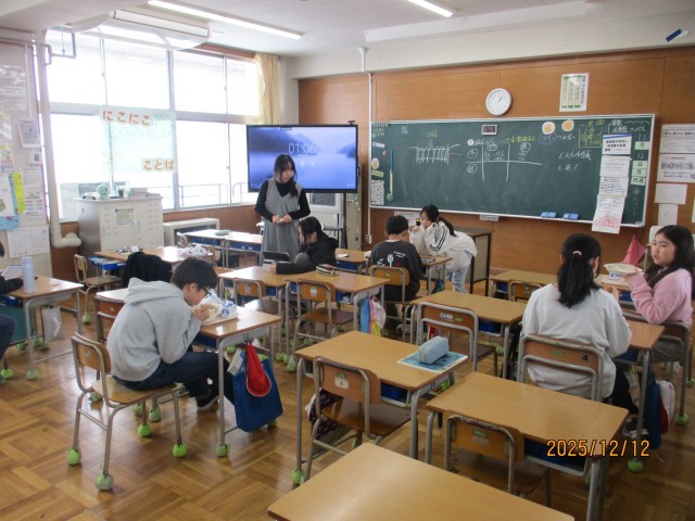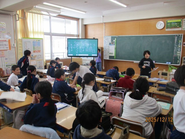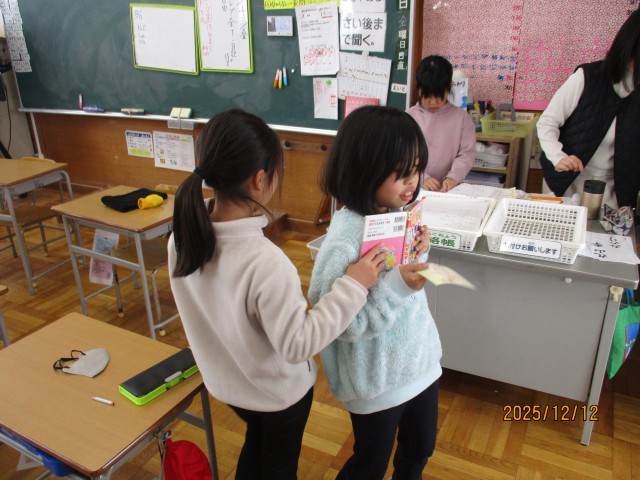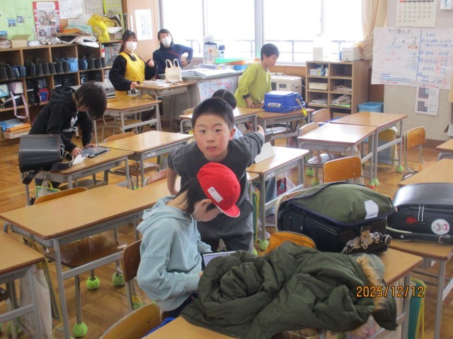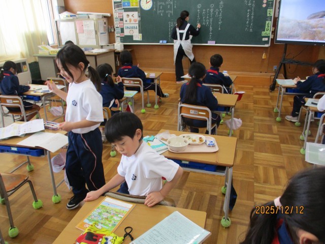 1年生教室は、給食を食べ終えた子どもたちが連絡帳を真剣に書いています。2年生教室は、ほとんどの子どもたちが遊びに行ってしまい、残っていた子は数人でしたが、帰りの支度を済ませ、急ぎ足で教室から飛び出していきます。3年生教室では、連絡帳を書く子や、「なぞなぞブック」を片手にクイズやなぞなぞを出題し、答え合っています。