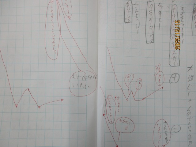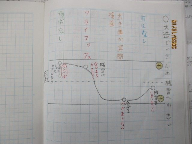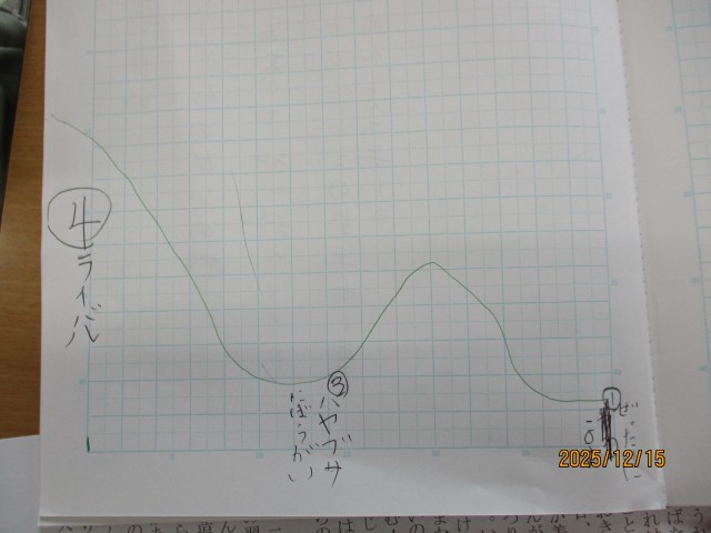 5年生の子どもたちは、ノートに心情曲線を描くなど、残雪に対する大造じいさんの心の揺れ動きや変化、変容を物語文から読み解き、話し合いを進めています。様々な解釈を出し合いながら、どっぷりと物語の世界に浸っていました。