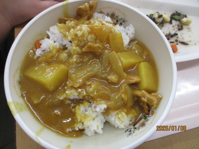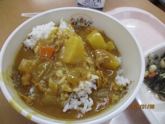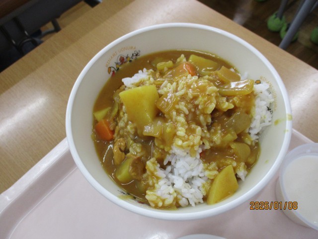 今日から始まった3学期。久しぶりの給食です。メニューは、「ポークカレー」「麦ごはん」「牛乳」「ひじきサラダ」「牛乳かん」です。