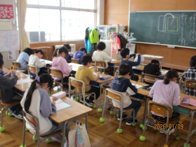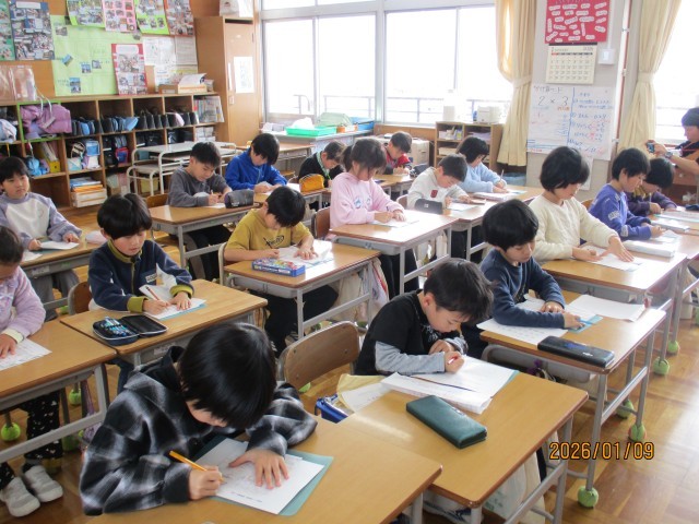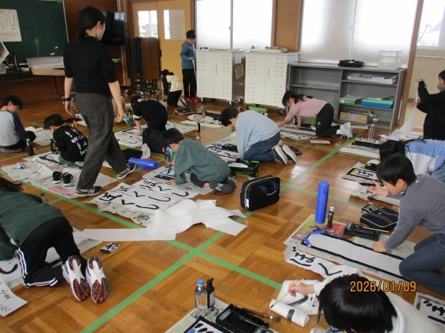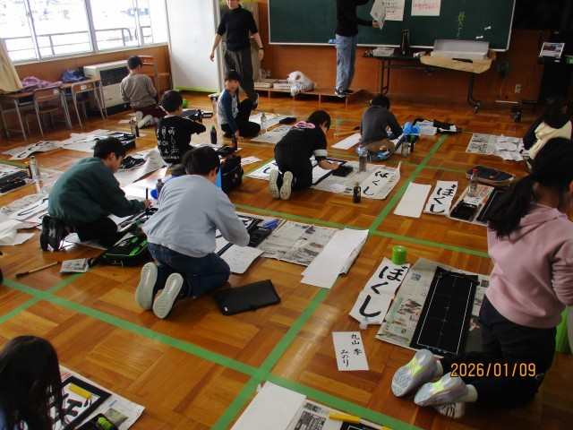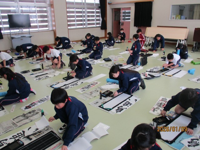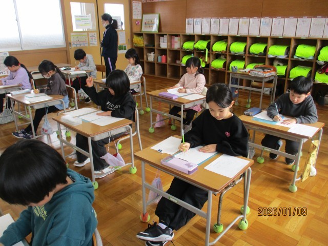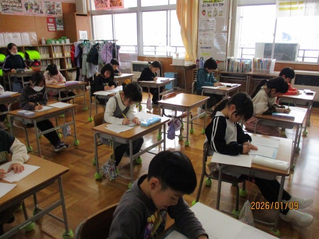 1・2年生は硬筆で、3~6年生は毛筆で、それぞれ心を込めて文字を書きました。子どもたちは、冬休みに練習した成果を発揮し、真剣な表情で筆を運んでいました。力強い文字や形の整った丁寧な文字が並び、一人ひとりの思いが込められていました。今年一年、子どもたちが書いた文字のように、まっすぐに、力強く成長していくことを願っています。作品は1月19日(月)から校内に展示する予定です。石打小学校へ来校された際には、ぜひご覧ください。