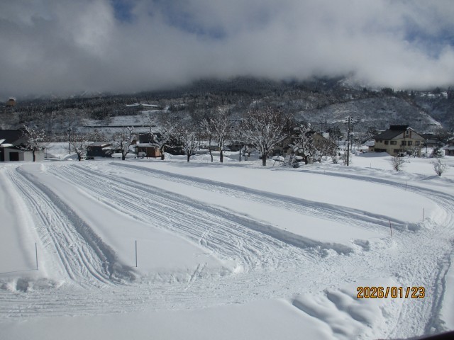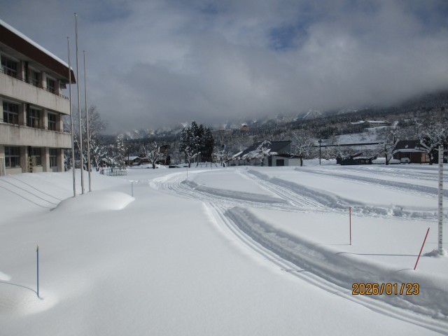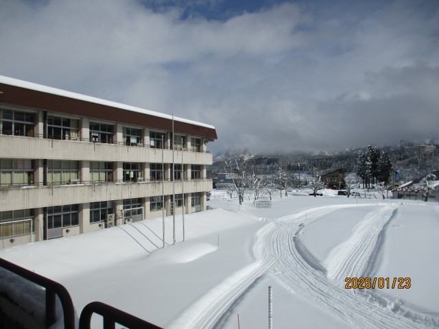 本日も午前中はちらちらと雪が舞っていましたが、午後になると、久しぶりの陽射しが差し込み、青空の見える面積はかなり広くなってきました。白く雪化粧した周りの山々、グラウンドのクロカンコース、すっぽりと雪で覆われた岩石園、除雪した大量の雪を積み上げた雪山・・・など、雪国ならでは風景が垣間見えます。