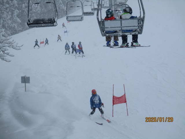 リフトから下りた後は、スキーウェアの前面が雪で真っ白です。ゲレンデ上部から滑り降りてきた子どもたちのゼッケンナンバーも雪で見えないくらいです。