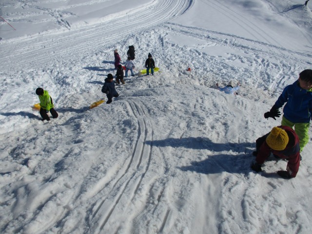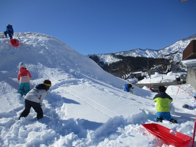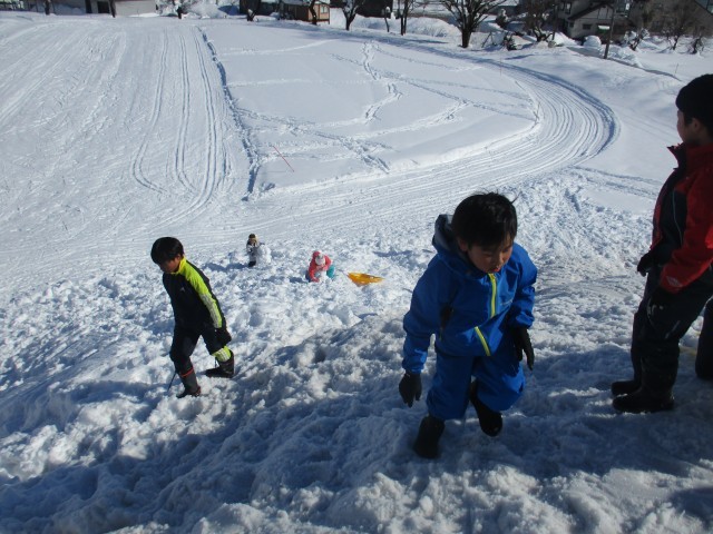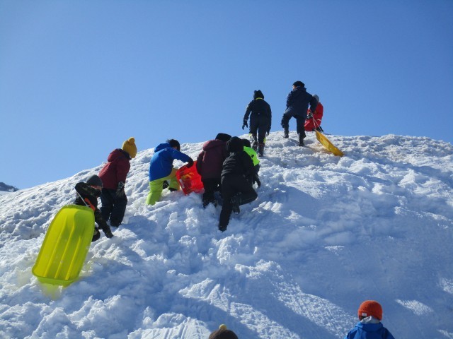 一目散に山頂を目指して駆け上がり、順番にそり滑りを楽しんでいます。雪まみれになりながらも、顔は満面の笑顔の子どもたち。冬の遊びを大いに楽しんでいます。