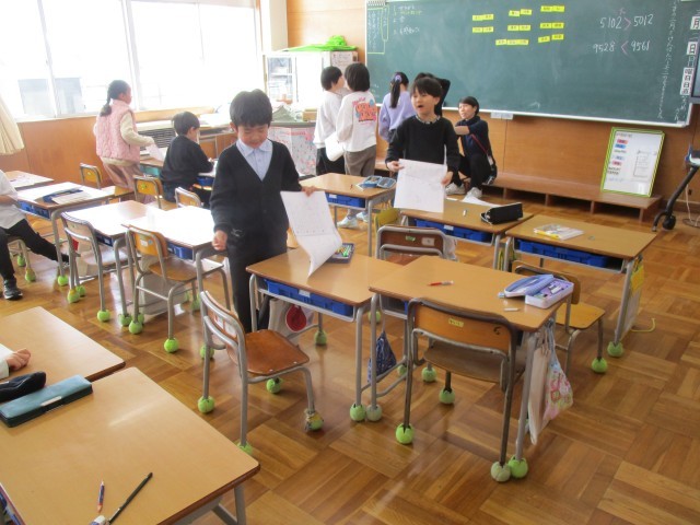 2年生は国語のプリント学習。教師のところへ丸つけや確認に行ったり、答えやポイントを互いに確認し合ったりと、個々に学びを進めています。