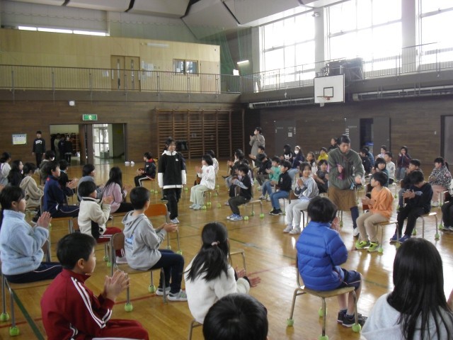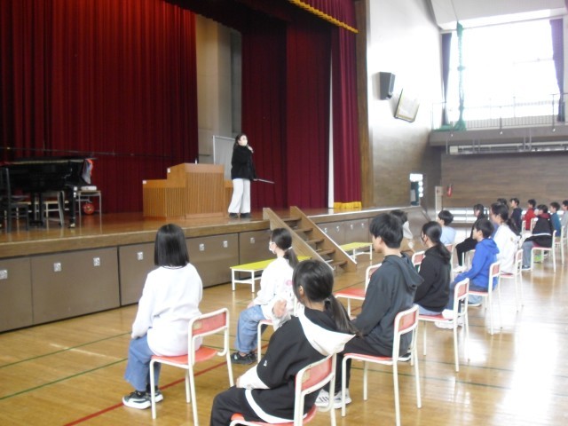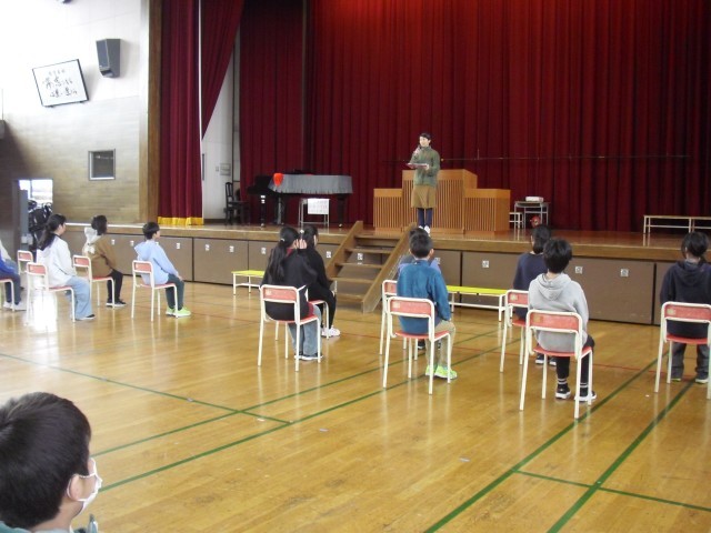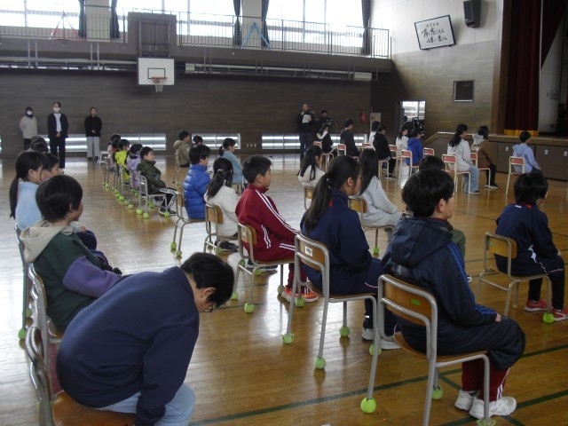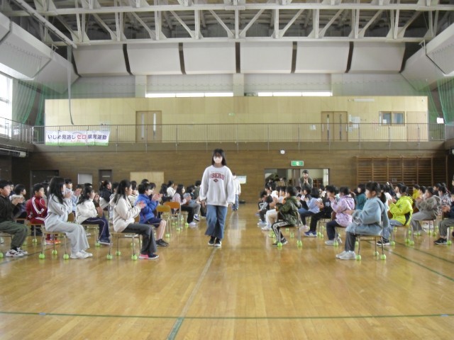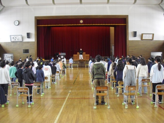 昨日の会が「動!」であるならば、本日の会は「静!」の場面になります。昨日の笑顔が本日はきりっと引き締まった表情に変わり、オンオフのスイッチをしっかりと切り替えて取り組んでいる全校の子どもたちです。