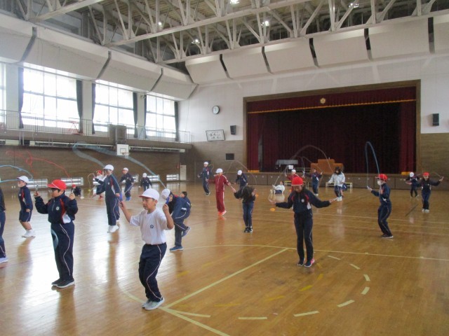 体育館では、3・4年生が合同体育をしています。短なわを使って前回し跳びや後ろ回し跳びなど、いろいろな技に挑戦しています。