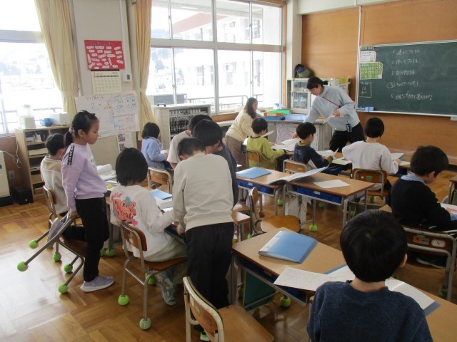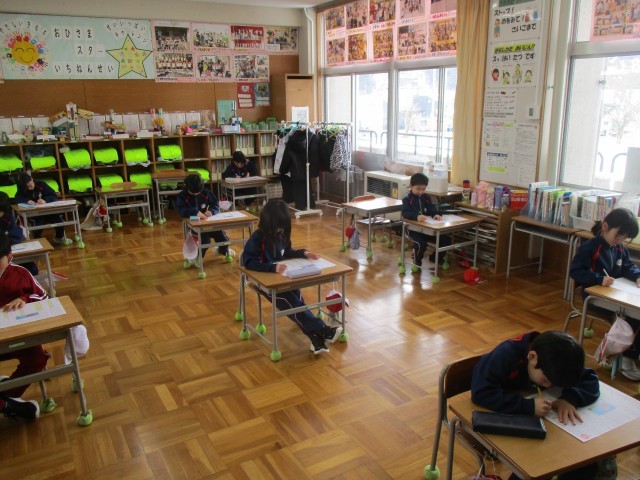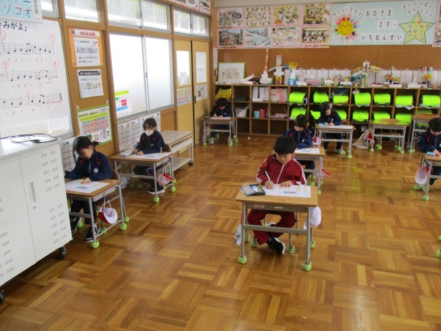 1年生は国語のワークテスト。しーんと静まりかえった教室に、カツカツと鉛筆で文字を書く音だけが聞こえます。それくらい集中しているのですね。