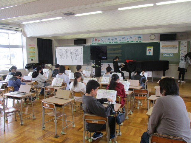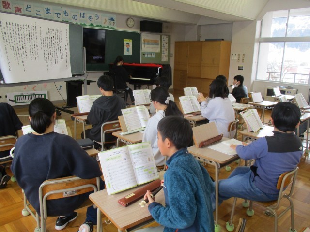 6年生は音楽。音楽室でリコーダーの練習をしています。教師の指示がなくても、各自が活動内容を自覚して練習に取り組んでいます。皆さんの集中力も◎です。