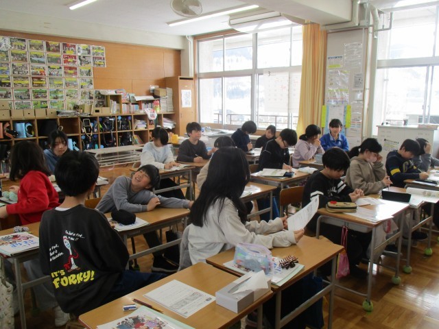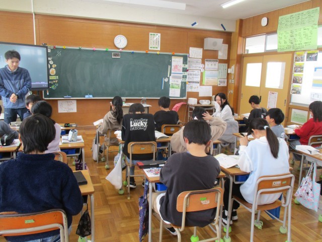 5年生は保健。事故や犯罪に巻き込まれないために気をつけることなどをワークシートに書き込んでいます。最近は、全国各地でいろいろな事故や事件が起きていますから、皆さんの学びも大事ですね。