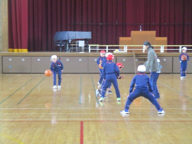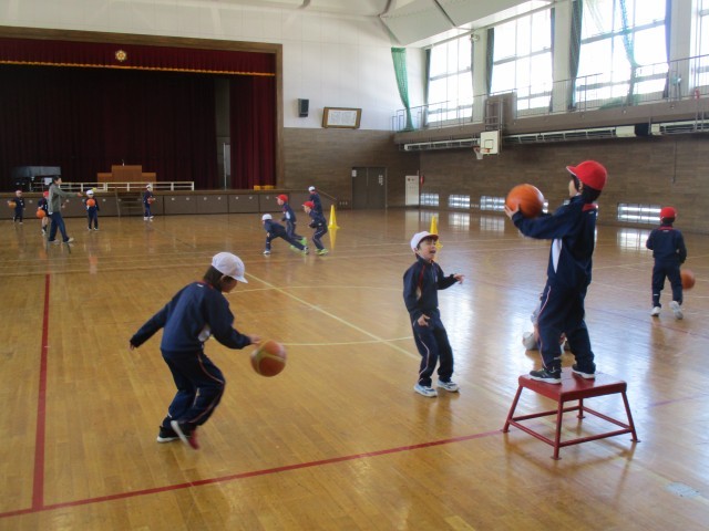 体育館では、2年生が体育の学習をしています。ボールのドリブルやパス、シュートの練習をしています。次学年で学習するポートボールにつながりそうですね。