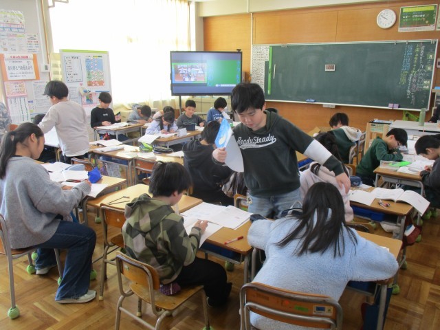 4年生は、教室で算数です。教科書巻末のまとめ問題を解いています。1年間の学びは確実に定着したかな?