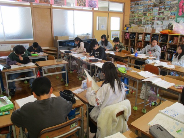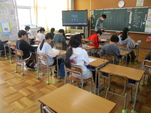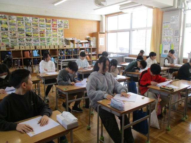 5年生は教室で国語の聞き取りテスト中です。CDから流れてくる音声をどれだけ正確に聞き取れるかな?