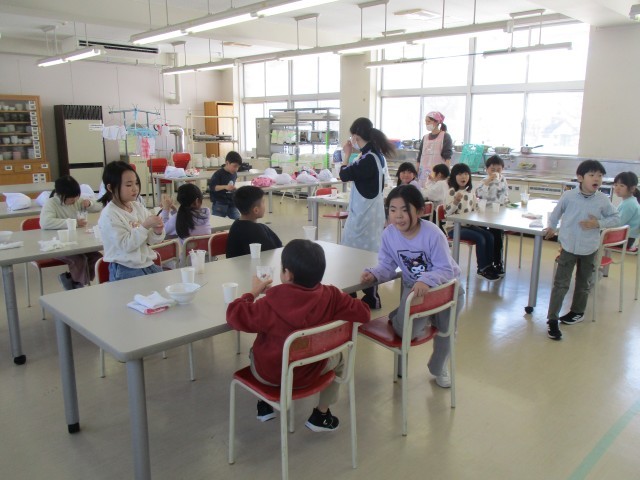 1年生は、家庭科室でパフェ作り。自分たちで好きなトッピングをのせて、個々に味わっています。あまり食べ過ぎて、給食を食べられなくならないようにね!