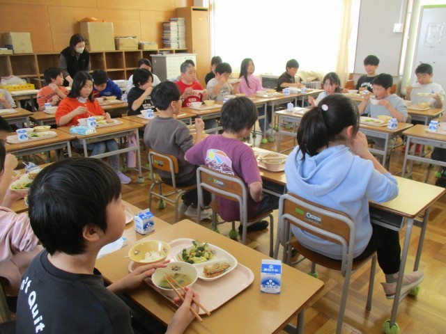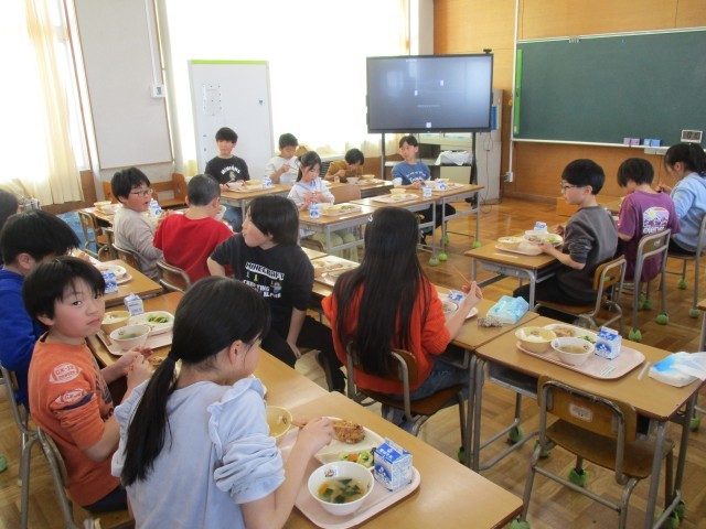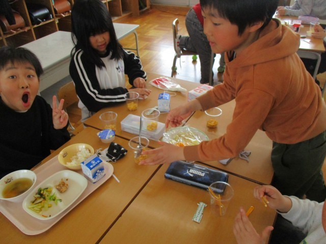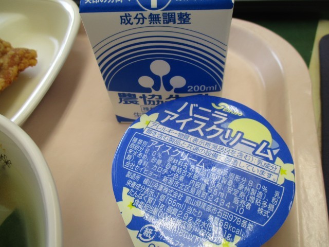 各教室を回ると、どの教室でも満面の笑顔で給食を味わっています。バニラアイスが配膳される12時30分に遅れまいと、急いで食べる子も見られます。多くの子どもたちは、デザートの配膳時刻前に食べ終わらせ、一安心の様子です。そして、冷えっ冷えっのアイスにスプーンを差し込み、一口味わったときには、さらに表情が緩んでいました。