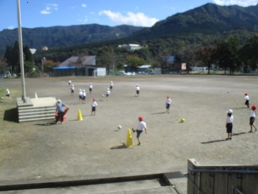 4時間目の授業時間は、1年生の子どもたちが元気にグラウンドで活動しています。大きなかけ声で準備運動を行った後は、早速ペアになってサッカーボールを使って「蹴る」「止める」「転がす」練習をしています。