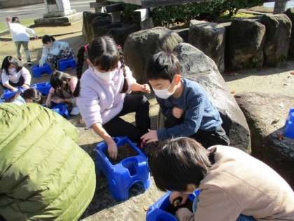 この日、1年生が、鉢に入った土の中に、3つの球根を優しく丁寧に植えました。春になって何色のチューリップの花が咲くのか楽しみです。入学式の頃、色とりどりのチューリップの花が咲く中、新入生を迎えたいと願う1年生の子どもたちでした。