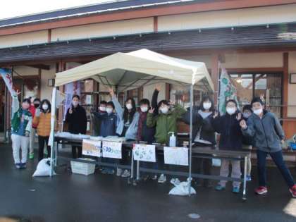 当日は、天候に恵まれ、この時期には珍しく、青空の下で販売することができました。道の駅ということもあり、県外からのお客さんも多く、子どもたちは駐車場に車が入って来るたびに、それぞれが大きな声で「美味(うまい)」のアピールをしました。