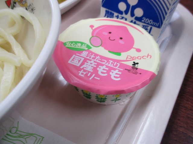 今日の給食は、6年生リクエスト献立です。「冷やしうどん」「つけ汁」「ちくわの2色揚げ」「海藻サラダ」「牛乳」「ももゼリー」です。