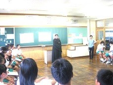 この日は、地域コーディネーター、学校運営協議会委員の皆様にもご協力いただき、11名のゲストティーチャーをお招きしました。最初はマントをまとったそれぞれのゲストティーチャーのお仕事をクイズ形式で当てる活動から始め、生徒たちも興味津々の様子でした。様々な職種の方からお話しを伺い、貴重な学びの時間となりました。