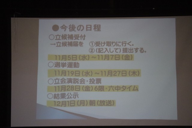 その後、選挙管理委員会から全校生徒に向け、選挙の意味やその重要性、また選挙活動に関する説明などが行われました。SNSやインターネット上での選挙活動の規制等、公職選挙さながらの規則を示すなど、よく考えられ、しかも分かりやすい説明でした。
