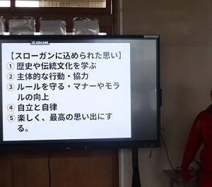 歴史や伝統を学びながら、主体的に行動・協力して自立と自律の力を伸ばし、最高の楽しい思い出をつくりたいという願いが込められています。
