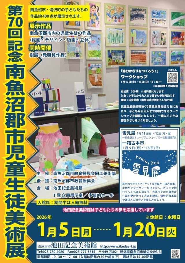 【再掲】1月5日~20日 南魚沼郡市児童生徒美術展 公開日 2026/01/14 更新日 2026/01/14 話題 【昨年末の記事の再掲です。】当校からも20名以上の生徒の作品が出展されています。今回は第70回の記念展で、楽しいワークショップも行われるとのことです。お時間のある方は、ぜひお運びください。詳しくは池田記念美術館のウェブサイト等をご覧ください。 いいね(1)