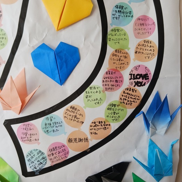 在校生からは、一人一人が感謝の気持ちを込めて書いたメッセージカードを、3年生教室に向かう廊下に掲示しました。それぞれが様々な形で3年生に接し、そのかかわりの中で学んだこともたくさんあったと思います。