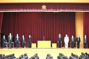 今日はまず、10名の転入・採用職員の新任式を行いました。それぞれの職員が自己紹介と挨拶を述べ、生徒代表からの歓迎の言葉を受けました。