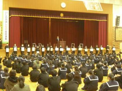 校長先生からは、1年を振り返って自己の成長を確認し、新たな目標を立てて欲しいという講話がありました。また、この長期休業中は、雪や交通事故に気をつけて過ごすこと、感染症に気をつけて健康に過ごすこと、家の掃除や雪かきなどを手伝い家族の役に立つこと、の三点を意識して生活してほしいという講話でした。