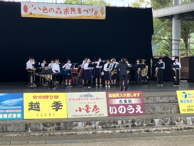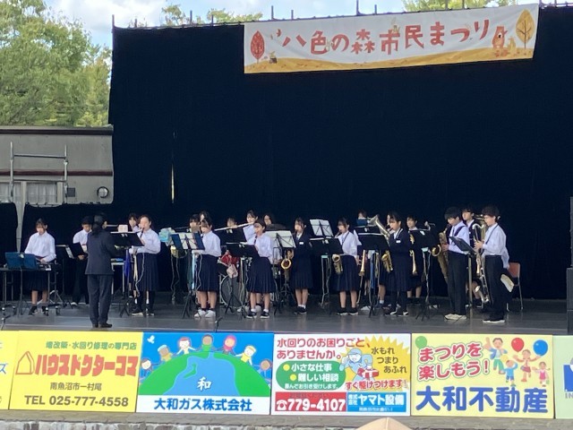 本日、吹奏楽部が「八色の森市民まつり」に参加し、「学園天国」など3曲を披露しました。とても素敵な演奏でした。演奏中、観客の皆様が聴き入っている様子がとてもよく伝わりました。吹奏楽部の生徒たちは大変貴重な経験になったと思います。