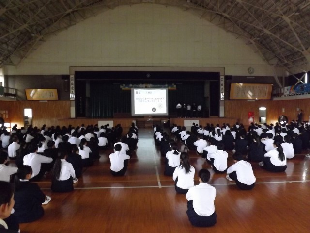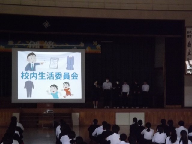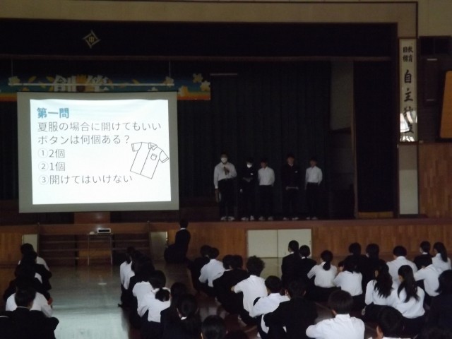 制服登校が始まったタイミングで、校内生活委員会ではワイシャツの着こなしや靴下のルールについて、クイズ形式で楽しく紹介しました。今週は「3分前入室キャンペーン」が予定されています。最近では、今年度の初めに比べて達成率が下がっている傾向が見られます。委員会からは「互いに声を掛け合って、意識を高めていきましょう」と呼びかけがありました。時間を意識して行動することで、より良い学校生活を築いていきましょう。