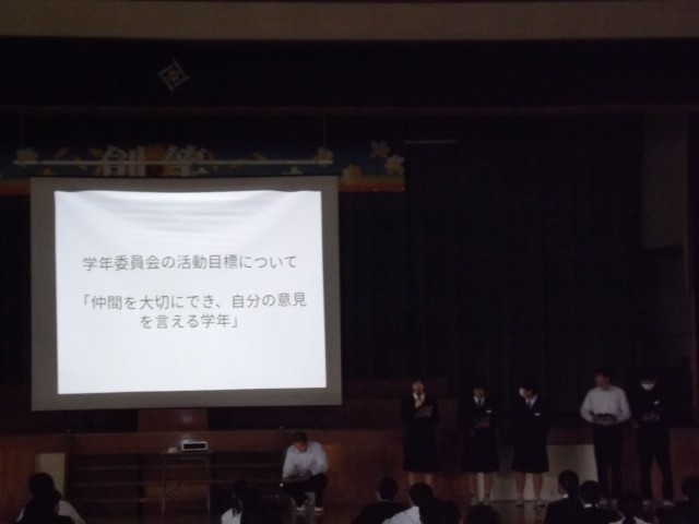 学年委員会では、「仲間を大切にでき、自分の意見を言える学年」をスローガンに掲げ、日々活動しています。今回の紹介では、「仲間を大切にすること」「自分の意見を伝えること」について、動画を交えて全校で考える機会を設けました。