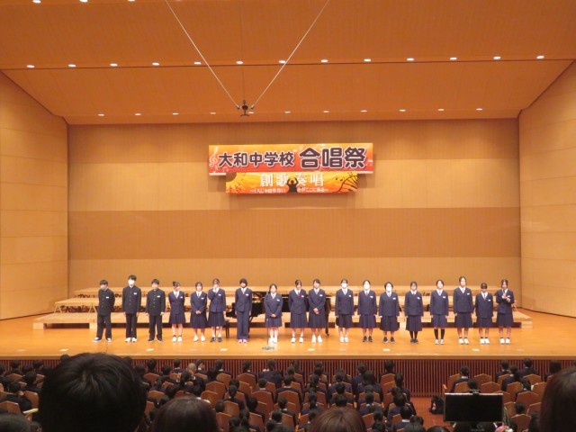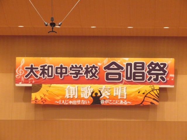 今年度の合唱祭にふさわしいステキな仕上がりとなりました。美術部長さんからは、ステージで「今年度の生徒会スローガンにあるひまわり🌻を絵の中に入れたり、フォントの雰囲気も合わせたりした」とのことでした。さらにすごいのが、「一人じゃ出せない」という意味を考え、文字とイラストの重なりまで工夫しました。本当ですね。よーく見ると、部長さんが言っているようにに、「副題の一人じゃ出せない音がここにある」を観客に見立て、真ん中の指揮者と「創歌奏唄」は歌っている生徒に見立てて、描いていますね。もちろん、演奏しているピアニストもちゃんと描かれています。合唱祭の世界観を見事に表現した作品ですね。