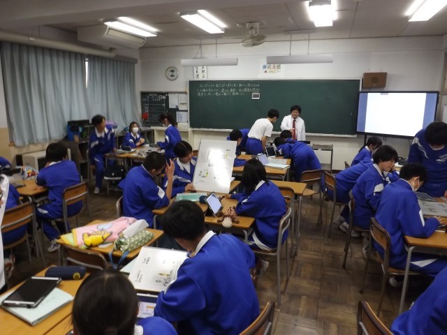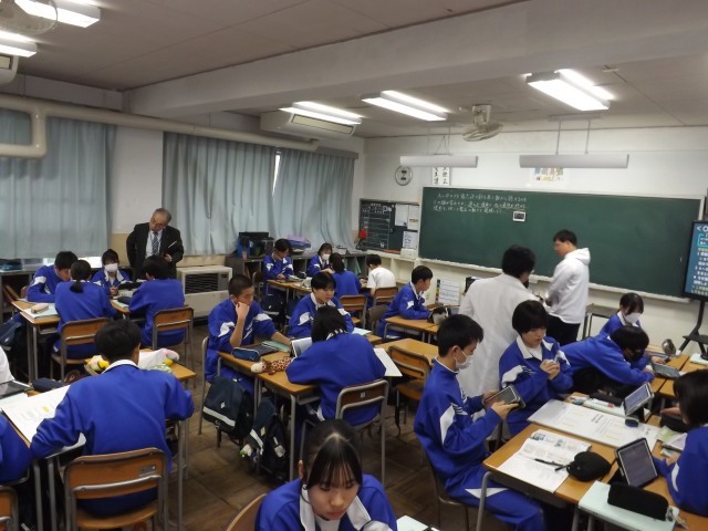 また、先生に質問したいときには、ロイロノートの共有ノートを活用し、クラス全体にも分かるように工夫していました。先生から「本当に○○かな?」と問い直されると、生徒たちは「見てこよう!」と自ら確かめに行くなど、とっても主体的に取り組んでいました!(画像3枚目参照)。