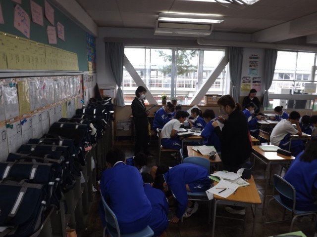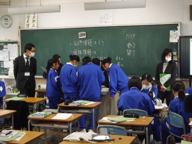 国語の授業では、杜甫の漢詩「春望」(『国破れて山河在り』で知られる作品)を題材に学習を行いました。授業の冒頭では、生徒たちが先生の説明(1つの必修課題と3つの自由課題)を真剣に聞いていました。(画像1枚目)。