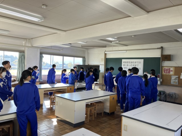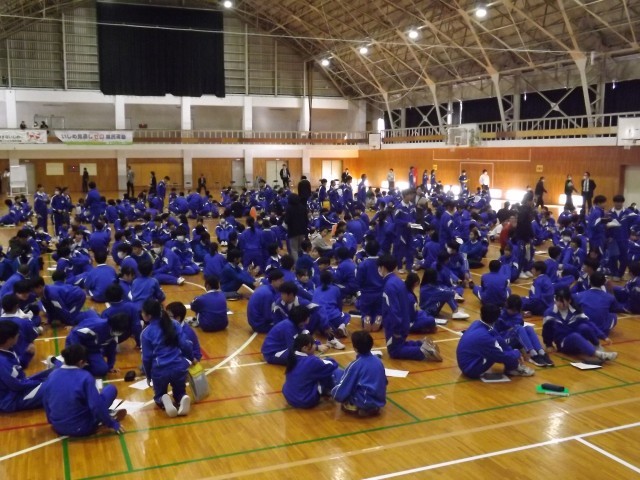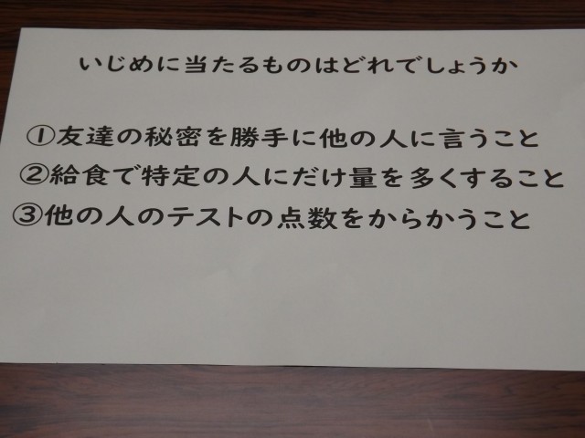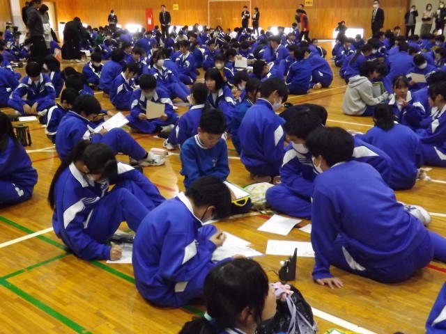 その後は、小学生と中学生が一緒のグループで校舎内の各教室でクイズをしつつ体育館へ移動。体育館では、いじめについて考えるとともに、「互いに認め合える大和中」を目指し、認め合うことの大切さについて次の4つのポイントを確認しました。