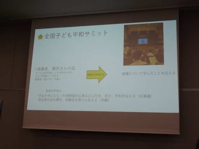 報告会では、各校がテーマに沿って発表を行いました。大和中学校は「全国こども平和サミットとてつのくじら館」について発表しました。