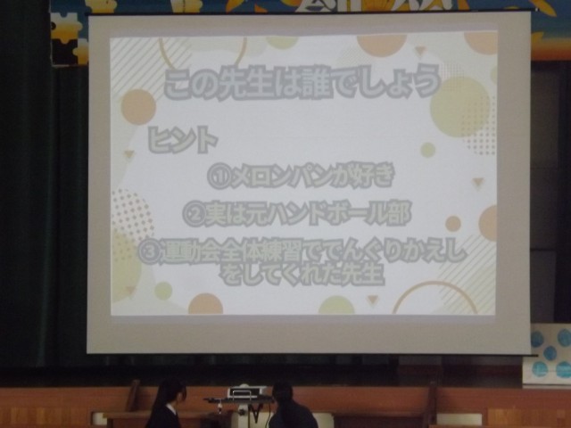 朝会では、「この先生は誰でしょうクイズ」や、3年生にまつわるクイズが出題され、会場は終始温かい雰囲気に包まれました。