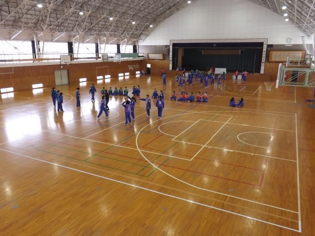 3年生の教室から1階の中央廊下へ向かう途中、体育館からは生徒たちの元気な声が聞こえてきました。楽しそうにバスケットボールをしている姿があり、卒業を迎えた3年生の静かな教室との対比が印象的でした。