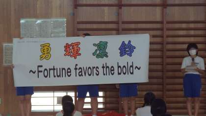 勇気凛凛は「失敗や危険をかえりみず、勇敢に物事に立ち向かっていこうとするさま」という意味。そこから、一人一人が、何事にも恐れずに目標に向かって皆で力を合わせて全力で頑張る。