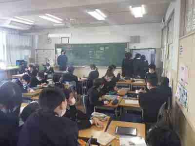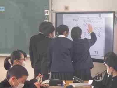技術では、身の周りにある製品はどのような材料が使われているかを考え、班で共有し、電子黒板を活用して意見をまとめています。電子黒板の活用が当たり前になった現代の授業スタイルです。