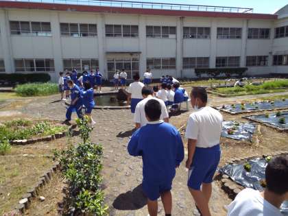 筆休みの中庭は1年生がいっぱい、自然に触れる場所になっています。